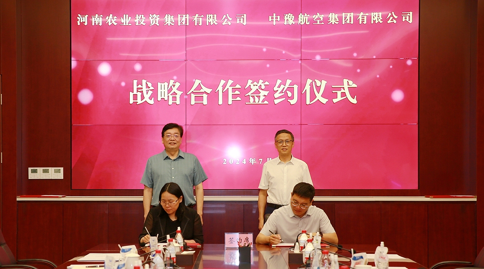 7月18日下午,中豫航空集團與河南農(nóng)投集團在農(nóng)投國際中心舉行工作會商,簽訂戰(zhàn)略合作協(xié)議。中豫航空集團黨委書記、董事長張明超;河南農(nóng)投集團黨委書記、董事長李曉寰,總經(jīng)理、副董事長張淑杰參加會談并見證雙方簽約。中豫航空集團副總經(jīng)理劉霞,河南農(nóng)投集團副總經(jīng)理張峰代表雙方簽署戰(zhàn)略合作協(xié)議。雙方相關(guān)業(yè)務(wù)負責(zé)人參加。