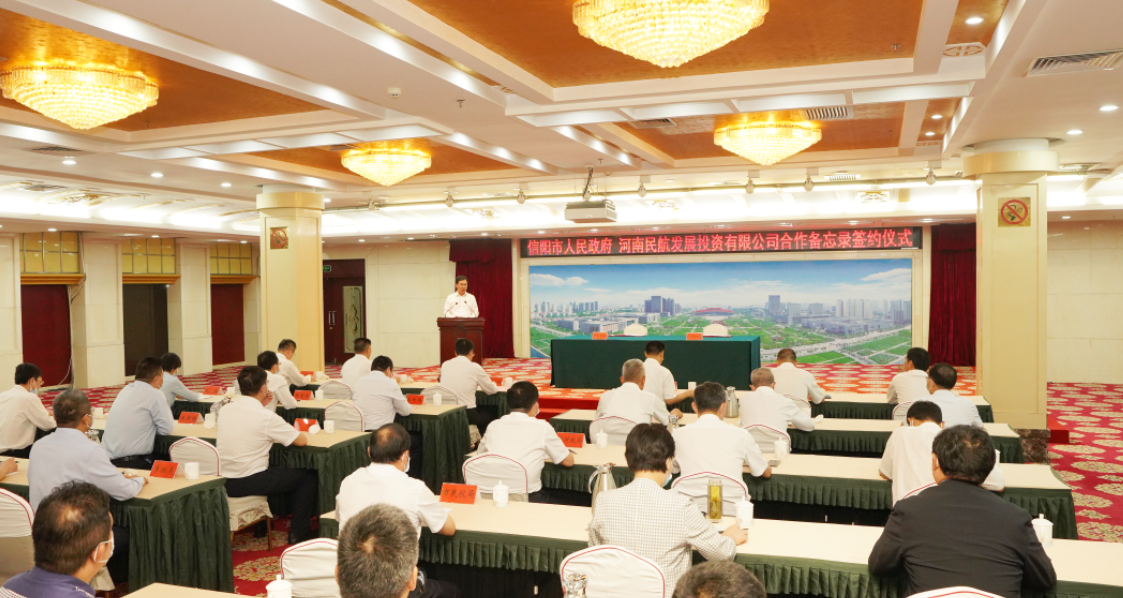9月10日,河南民航發(fā)展投資有限公司與信陽市人民政府在信陽市行政中心簽約,以項(xiàng)目為抓手,就發(fā)展航空產(chǎn)業(yè)、推動(dòng)信陽革命老區(qū)振興展開全面合作。信陽市委書記王東偉,市委副書記、市長蔡松濤,河南航投黨委書記、董事長張明超,總經(jīng)理、黨委副書記、副董事長劉建葆,以及信陽市委常委、市委秘書長楊進(jìn),副市長呂旅,市政府秘書長張全勝,河南航投副總經(jīng)理謝亞偉、喬長恩參加儀式。雙方在簽約前進(jìn)行了座談,張明超與蔡松濤在儀式上分別致辭。