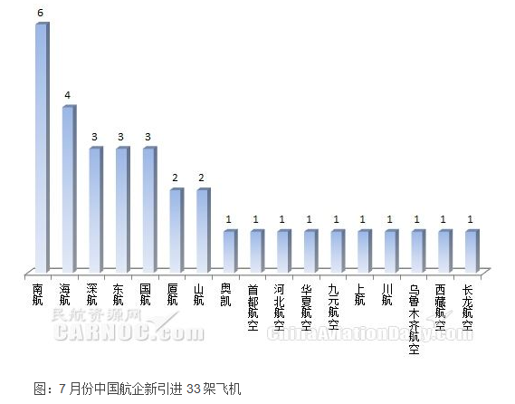 根據(jù)民航數(shù)據(jù)分析系統(tǒng)CADAS,2016年7月份中國(guó)大陸航空公司新引進(jìn)飛機(jī)33架。其中南航引進(jìn)飛機(jī)數(shù)量最多,為6架;機(jī)型方面,737-800飛機(jī)數(shù)量最多,為16架。