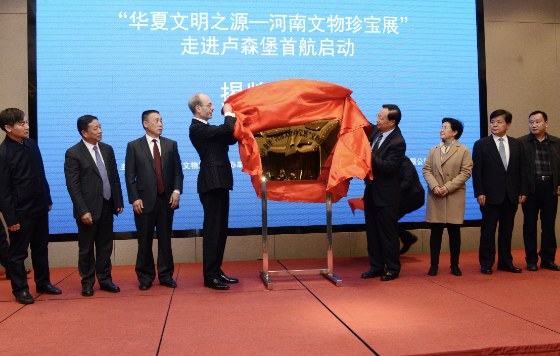 河南省政協(xié)副主席高體健,盧森堡駐華大使俞博生,河南省文物局局長(zhǎng)田凱及河南航投總經(jīng)理、黨委副書(shū)記、副董事長(zhǎng)劉建葆,副總經(jīng)理郭艷紅等出席儀式。高體健、俞博生、劉建葆分別致辭。高體健和俞博生共同為啟動(dòng)儀式揭牌。